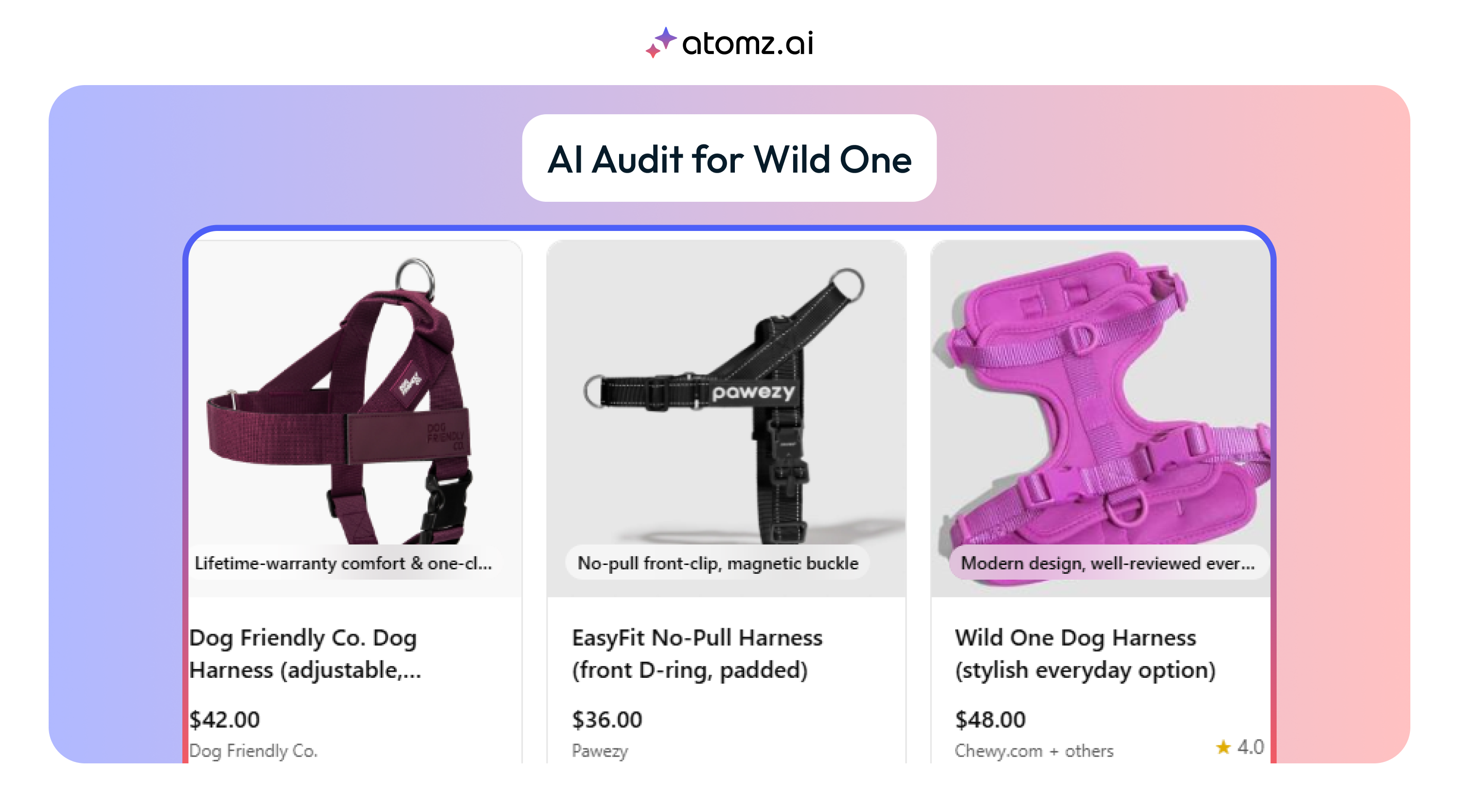 Wild One Dog Harness featured at $48 as "stylish everyday option" with Dog Friendly Co. Dog Harness ($42), EasyFit No-Pull Harness ($36)