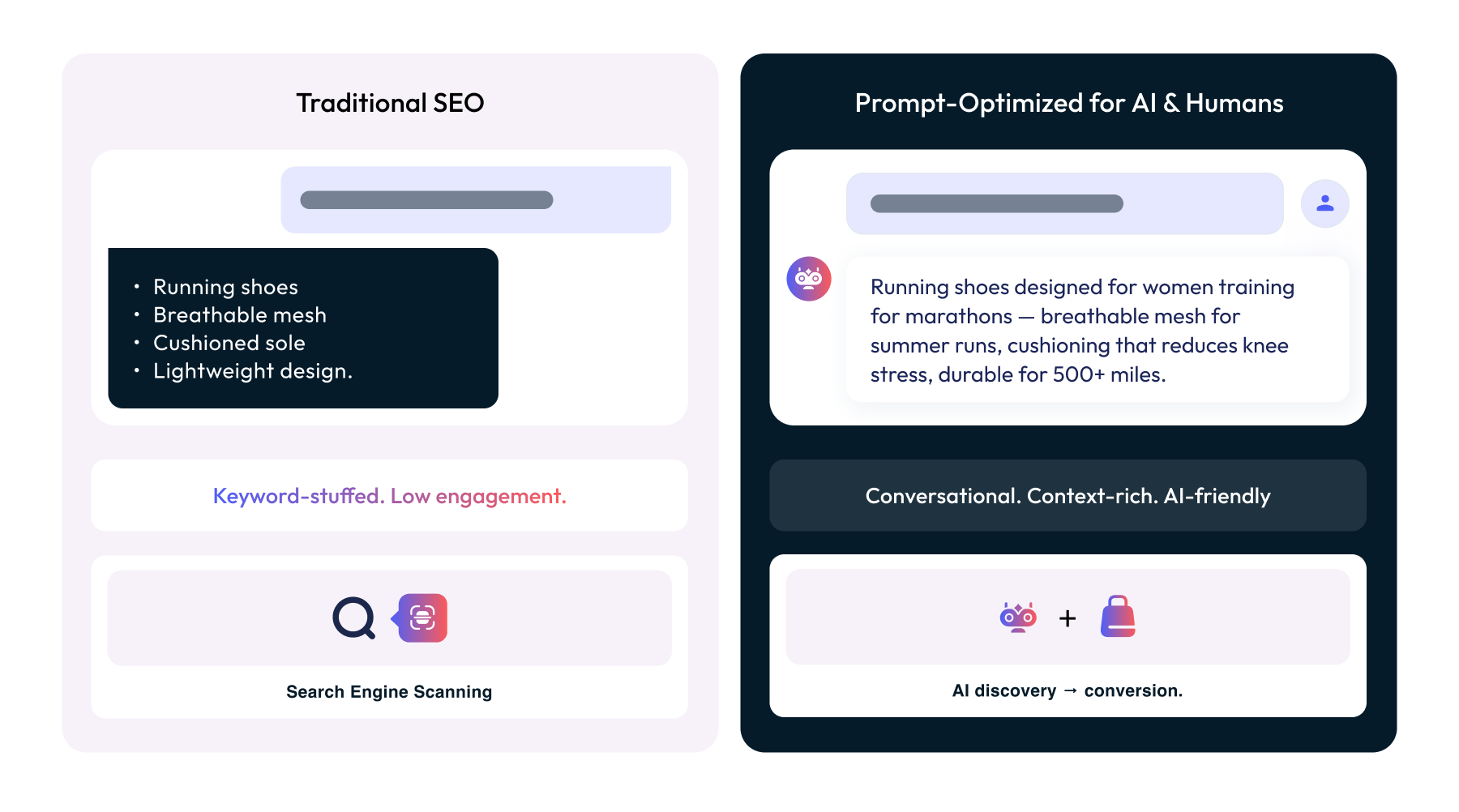 Discover how to write PDP copy that AI systems can understand and recommend in our article on Prompt-Optimized Product Descriptions, a framework for aligning human-readable and machine-readable content.